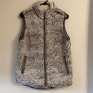Brown and Ivory full zip vest with brown trim. Extra cozy and warm with two front zip pockets. Excellent condition. Polyester