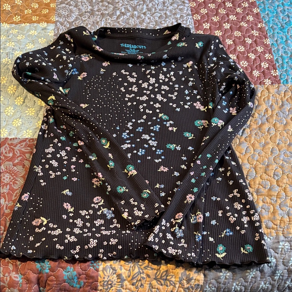 Stylish black ribbed top with floral patterns. Ideal for casual outings.girks xl 16