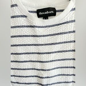 Knit waffle crewneck tee with navy blue multi-stripes, EXTREMELY stretchy and long (would honestly be perfect for pregnancy though not a maternity top)