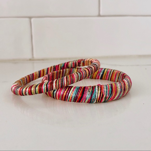 Two bangles or varying thickness covered with multicolored threads. Gently worn and in great condition. Each bangle measures 3” in diameter.
