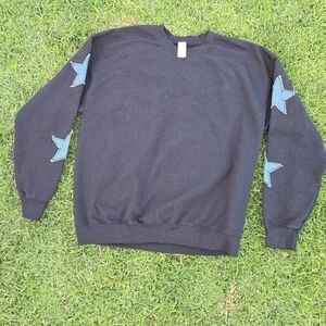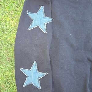 Stylish black sweater featuring blue star accents on the sleeves. Perfect for a casual yet trendy look.