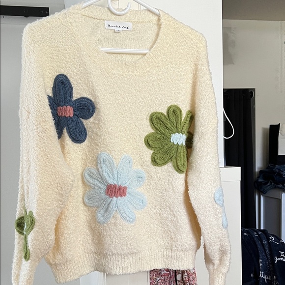 cream crewneck sweater with textured knit and bold floral appliqués. Features blue, light blue, green, and pink flower accents for a playful, feminine look. Soft, cozy fabric with a relaxed silhouette that's easy to style for everyday wear.