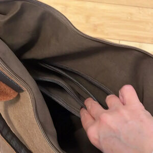 Threaded pair, canvas shoulder bag brown 17×20 several zip pockets adjustable straps vegan leather handles zip closure perfect weekend getaway bag great for travel, gym or work