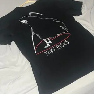 Bold black tee with striking graphic. Features 'Take Risks' design. Ideal for casual wear.