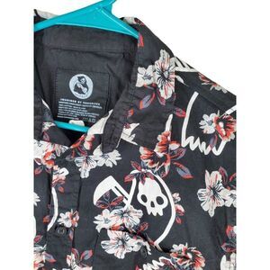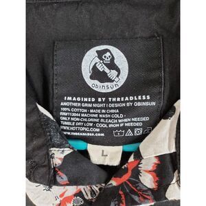 Threadless Obinsun Shirt Floral Skulls Reaper Spellout AOP Button Men L Black SS