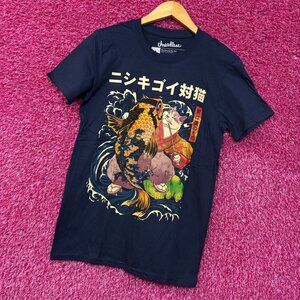 Threadless The Cat and the Koi Graphic Design T-Shirt Small. Generally measures 18 inches pit to pit 26 inches long. Amazing graphic design shirt depicting a cat in a kimono with a samurai sword fighting a koi perfect for Japanese aesthetic fans. Japanese Text on top reads " Koi Fish Vs. Cat " and on the side reads " You are Mine!" . New never worn overstock in great condition