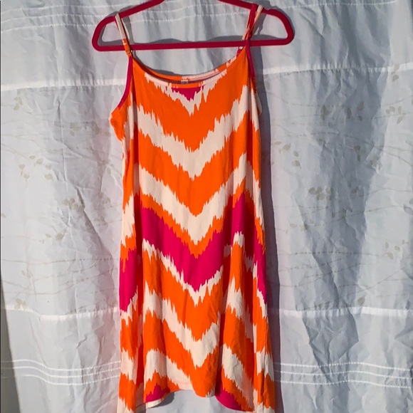 Brightly colored pink and orange gown with adjustable straps. Longer at the sides then in the front and back made by threads for thought, size large