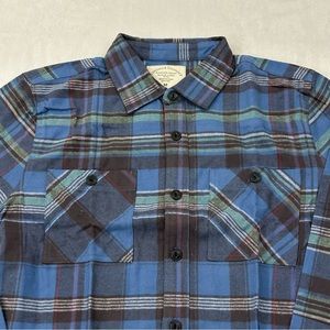 Brand new with tags. Never worn in excellent condition. Made by Threads For Thought. Really nice material with an awesome color way. Blue with navy & green plaid flannel long sleeve button up shirt. Men’s size medium.