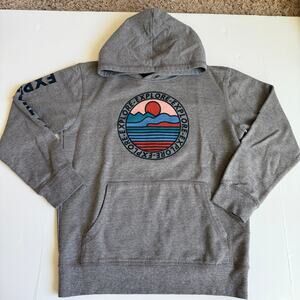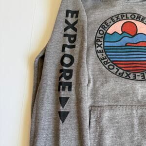 Size Youth 10, Threads 4 Thought, Kids Explore Graphic Hoodie. Super soft taupe heathery fleece, hoodie stamped with a call to action on the chest and sleeve. Large front pocket. 60% cotton 40% polyester. No stains or flaws, very good used condition.