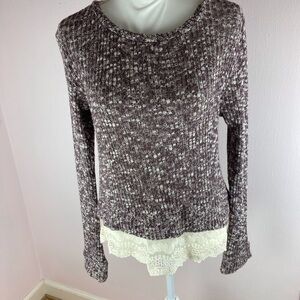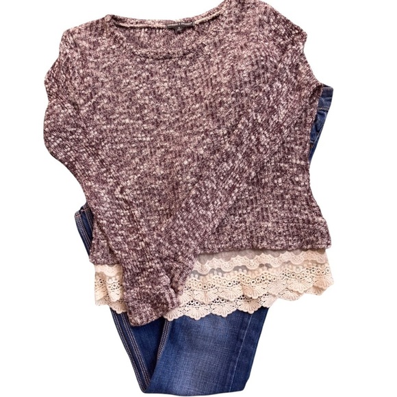 Textured knit with lace hemline creates a layered look that pairs well with jeans or leggings.