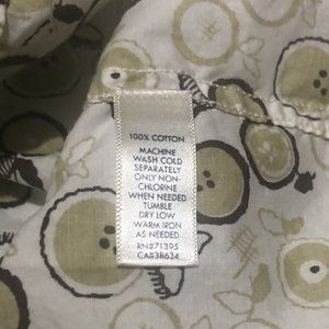 This Threads brand button-up shirt is perfect for your little one in size 12-18 months. The shirt features a fun and cute apple pattern in shades of green, brown, and cream. The shirt is made of 100% cotton and has long sleeves with a button closure.