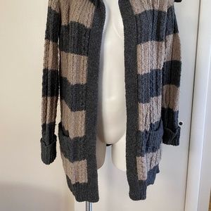 Threads Wool/Alpaca/Acrylic blend Duster Cardigan (Saks 5th Ave,) cable knit, Charcoal and Tan stripe, hand pockets on front/sides