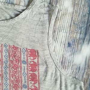 Threads Studio boho elephants tank top. This tank top is a light weight soft flowy material with raw cut edges at the bottom that is manufactured done. I'm not sure exact size but I'm going to guess about a Size M and here are the measurements armpit-armpit about 19 inches & Top-bottom about 22 inches but are not even. In a light heather gray color. In good used condition.