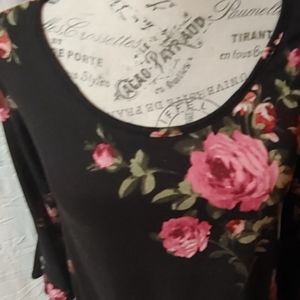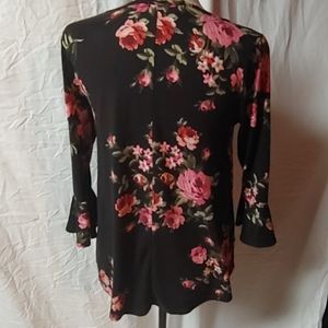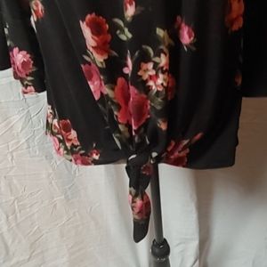 Nice. Very pretty black blouse with pink roses. Sleeves have bells at the ends. Material is stretchy. Has ties at the bottom front. It is in excellent condition.