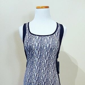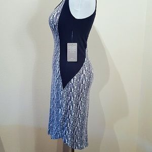 Comfy-chic dress by Threads for Thought, a lifestyle brand focusing on ethical work & sustainable design. Eye-catching geometric pattern front, back. Super soft and feminine ribbed black neckline and shoulders. V-tapered, black ribbed sides minimize waistline. Falls right above the knees, subtle high-to-low hem. Body contouring and super flattering fit. Pair with a belt and make any length desired.