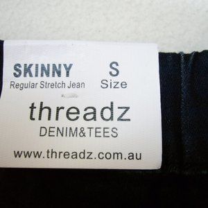 New with tags womens Threadz Skinny Regular Stretch Jeans, from Australia, pull on, black insets on front and down side of pants, size s, no rips tears stains.