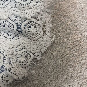 Size medium boho chic cotton spandex blend crochet lace bell bottom jeans. The lace portion on the bottom has signs of wear as shown in the last few photos. There is a hole on the back shown in the last photo.
