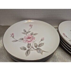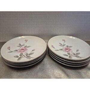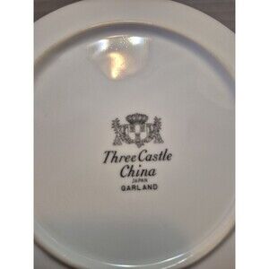This is a vintage set of Eight-Piece Three Castle China salad/dessert plates featuring a floral Garland pattern with pink roses. The plates are made of Bone China in white, pink, and gray colors, with a diameter of 6 1/8". The set includes bowls and was manufactured in Japan.