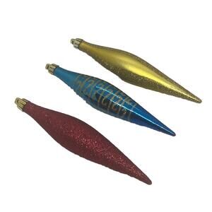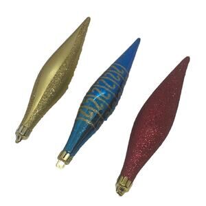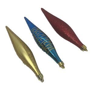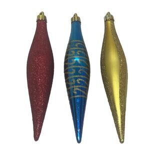 Three Christmas Tree Ornaments Shatterproof Red Blue Gold Glitter Tear Drops