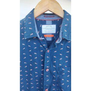 Lot of 3 (three) Denim and Flower short-sleeved button-down shirts. Size Large, see photos for measurements. Prints include: gray with cactus print, Blue with fox print, Dark gray with pink flamingos.