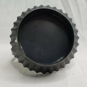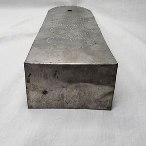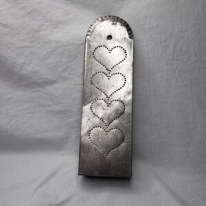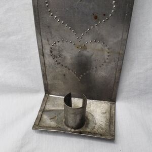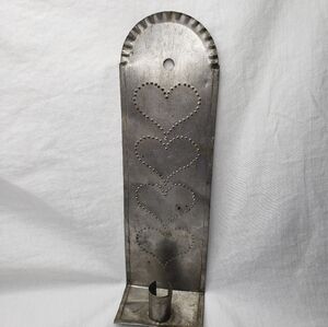 Punched tin candle holder. It measures 11 3/4 inches tall and 3 5/8 inches wide. Some bend marks at the bottom.