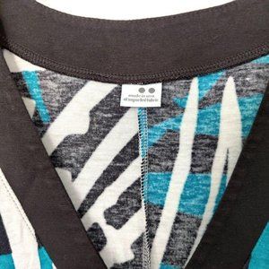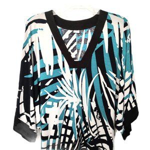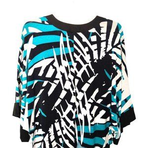 Three Dots midi dress with leaves prints in teal, white, and black; v-neckline; loose, oversized short sleeves; 94% viscose, 6% spandex shell; 92% viscose, 8% spandex trim.