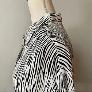 Three Dots blouse, zebra print blouse, animal print top, tie front button down, black white patterned blouse, viscose long sleeve top, collared blouse, high low hem shirt, statement print blouse, trendy animal print top, work to weekend blouse, chic office top, stylish casual blouse, breathable viscose shirt, bold patterned blouse, classic button down style, modern wardrobe staple, elevated casual blouse, women’s size large top, capsule wardrobe blouse, monochrome print shirt