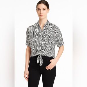 Three Dots Zebra Print Tie Front Button Down Blouse Black White High Low Hem L