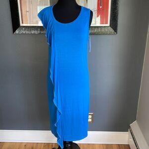 Three Dots royal blue wide side/shoulder ruffle stretch jersey sleeveless midi. Viscose/spandex blend. Medium. New, with tag. Nonsmoking home.