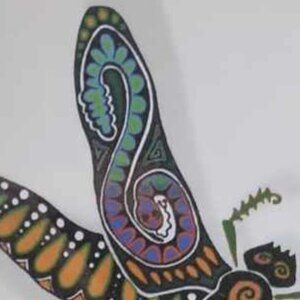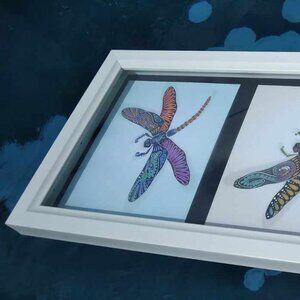 These are Three Dragonflies Original Art prints with Subliminal Wing Designs framed in a White Wood Frame Under Glass. These Dragonflies are hovering in a vibrating swirl of color, movement and texture which reflects that motion along with a shadow effect that gives the art an almost 3D effect. There are also some subliminal designs hidden within the wings - Kokopelli, Gecko & Snake - just for added fun. This design is influenced by Southwestern icons and the artist's love of hiding things in things. The prints are dry-mounted and are under real glass and are original graphics designed by Award Winning California Artist John A. Conroy.