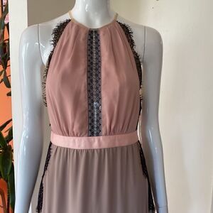 Three Floor Mauve, Pink, & Black Lace Halter Midi Dress with Skirt Pleating