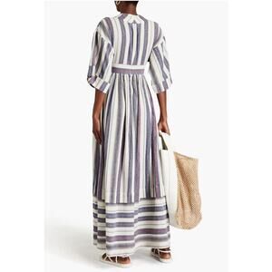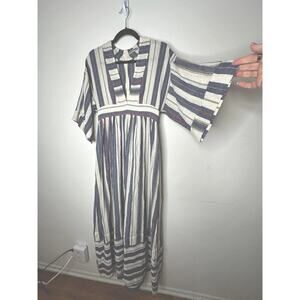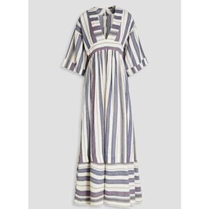 Three Graces London Ferrer Tan Blue Red Striped Cotton Blend V-Neck 3/4 Sleeve Maxi Dress Tan Blue Red
