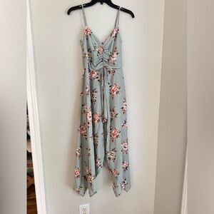 Chic floral midi skirt with an asymmetrical hem. Soft blue fabric with delicate floral design. Ideal for versatile styling.