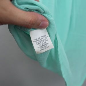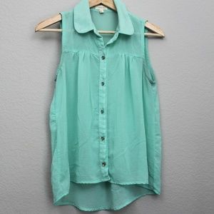 Collared sleeveless tank top with ruching in back. Sheer greenish blue color.