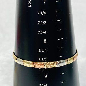 Three large identical bangle bracelets with mixed metal colors of gold, copper, and silver in segmented rectangles with an elephant in each one. The diameter is approx. 2.75" with an 8.64" circumference. Looks great on a 7.5" wrist. On bracelet mandrel, the size is between 8.5" and 8.75". Great overall pre-owned condition. Color and finish is good on all of them. Wear one, two, or three at a time.
