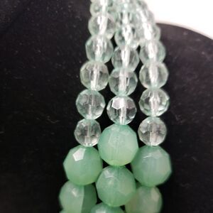 Three Layer Green Ombre Necklace, Three Shades of Faceted Green Acrylic Beads. This is a beautiful necklace; I love the colors. Three different sizes and shades of green faceted beads. It has some weight to it; it is over three ounces. Shortest strand measures about 18 inches, but there is an extender that is almost 3 inches. Clasp and extender look a bit worn, but they still work well. It is pre-owned with minor wear, but still in good condition.