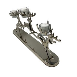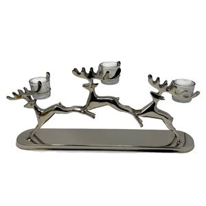 Three Leaping Reindeer Nickel Plated Brass and Stainless Steel Finish and Glass Votive Candle Holder.