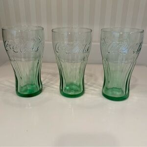 Three light green Coca Cola drinking glasses. 16 oz. embossed contoured tumblers. Six inches tall.