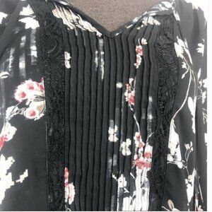 White House Black Market Long Sleeve Blouse SZ 2 (Small) Pre Loved Condition - Some Minor Flaws to Lace On Arm Details – Hi Lo Circle Hem – Sleeves Have a Button Closure to Show Off a Puffy Sleeve - Sheer Fabric – Floral Accent – Pleated Style Front and Back Details Body: 100% Polyester (Somewhat Sheer) / Lace: 55% Nylon & 45% Viscose Approx Measurements: SZ 2/XS fits up to M Length 26-31 in / Pit to Pit 20 in / Sleeve Length 25 in / VNeck Angle 9 in