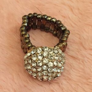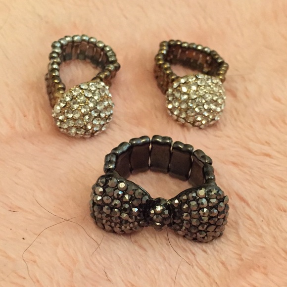 These rings are one size fits all, as the bands are made of metal held together by elastic. One ring is black with a bow covered in gray rhinestones. The other two are gold and silver with a circle covered in silver rhinestones.