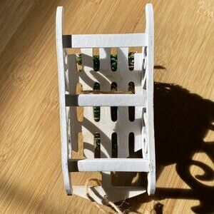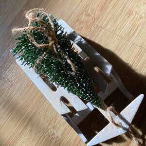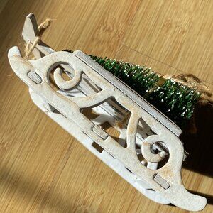 Sleigh is wood with a shiny green glitter tree with snow (white paint) on top. Approximately 5 inches long & 2.25 inches wide.