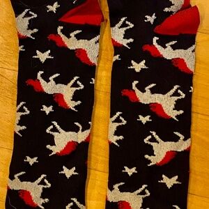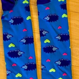 Three Pairs of decorative soccer socks-2 from MadSportStuff. One pair is navy with white and red unicorns. The light blue MadSportStuff socks are taller than the navy and more heavy weight. This 2nd pair of MadSportsStuff socks have pink llamas and hearts. The turquoise blue 3rd pair of socks have purple hedgehogs and neon pink and green hearts. These socks are taller and more heavyweight than the navy.socks. All 3 pairs are cute and have wide comfortable stretchy material at the top of the socks. These soccer socks are fun to wear and are in very good condition.