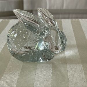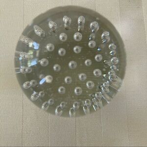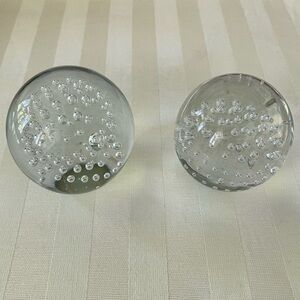 Three paperweights. Two vintage clear round glass paperweights with bubbles. Murano style paperweights. Approximately 2.5” tall, one is slightly larger than the other. The larger one has spiral bubbles and weighs 13 oz. The smaller one has bubbles in the bottom half and weighs 11 oz. There are no markings or name and I am not seeing or feeling any chips or scratches. Bunny is approximately 11 oz. Excellent condition.