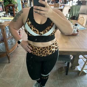 This three piece set comes with a sports bra, jacket and leggings. The jacket and leggings have sheer trim