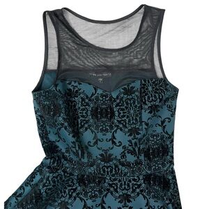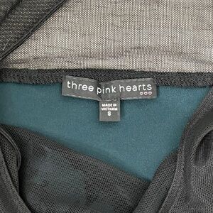 Three Pink Hearts A-Line Green & Black Sleeveless Dress - Size Small. Preloved in fantastic condition (washed but never worn). Side zipper. Sheer black upper (pics were taken laying flat so it appears lighter due to my flooring). Base color is deep green with black velvet pattern. Measurements are in pics, however additional measurements available upon request.
