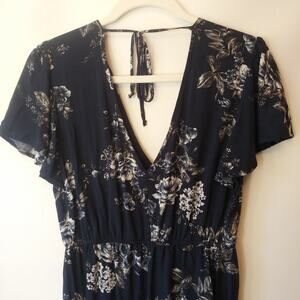 Three Pink Hearts Size M Medium Lightweight Flowy Romantic Blue Floral Maxi Dress with Double V-Neck, Flutter Sleeves, Two Front Slits, and Covered Button Detail