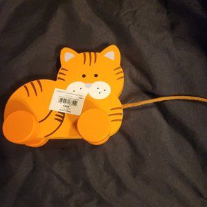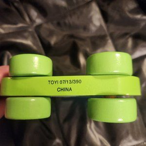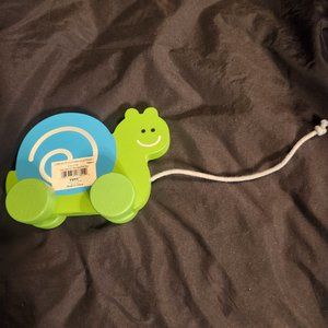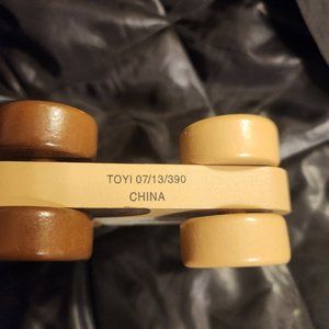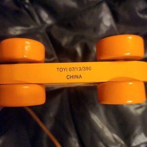 All three toys are wooden with an approximately 7" string that is suitable for toddlers aged 18 months and up. They help develop small and large motor skills and are durable and safe for children. The wheels are approximately 1.25" in diameter and 1/2" thick on each toy.