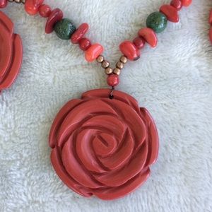 Three carved red roses , red coral, greenstone gemstones, copper beads and clasp.
