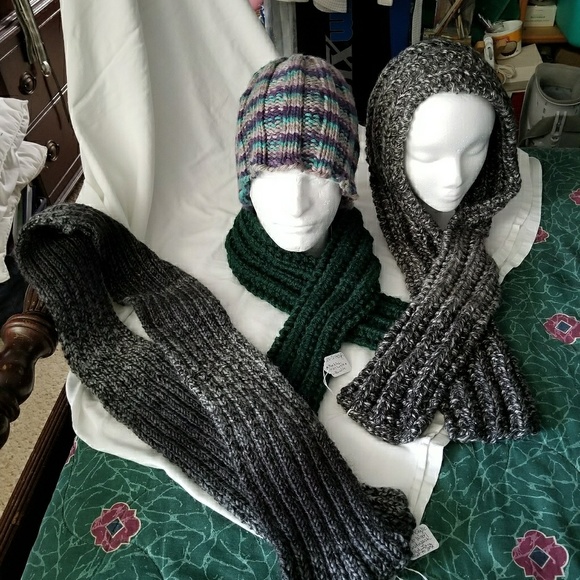Two black and gray scarfs and one dark green. All machine washable and dryable. Warm to wear.