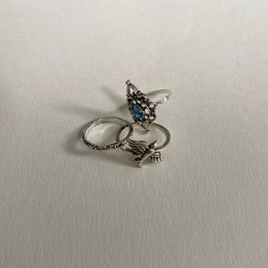 One ring with a flying bird, one with a blue gemstone, and one with a swirled pattern on it.